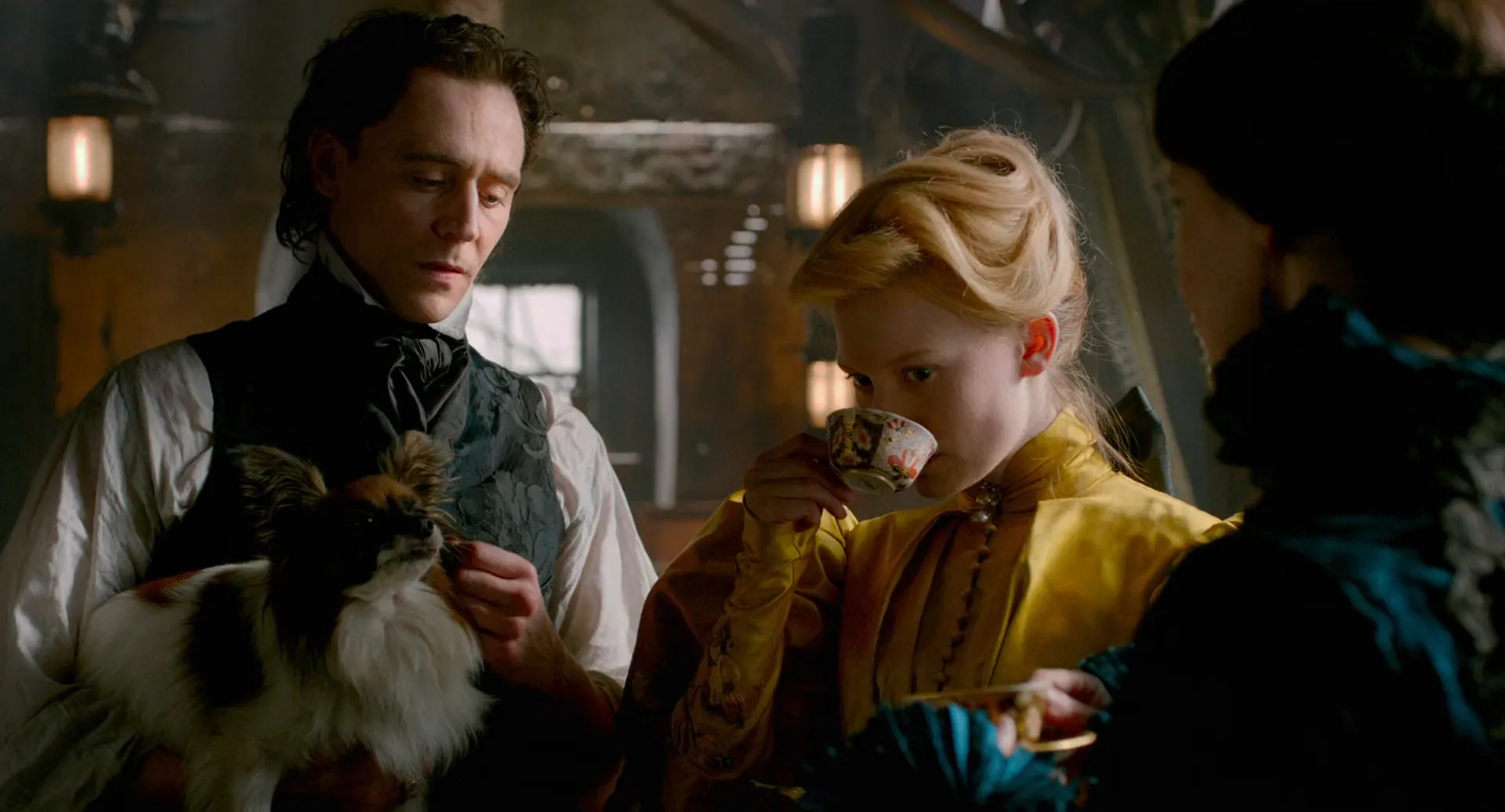 Mia Wasikowska as Edith Cushing, Jessica Chastain as Lady Lucille Sharpe, Tom Hiddleston as Sir Thomas Sharpe, Charlie Hunnam as Dr. Alan McMichael, Jim Beaver as Carter Cushing, Burn Gorman as Holly, Leslie Hope as Mrs. McMichael, Jonathan Hyde as Ogilvie, Doug Jones as Edith's Mother / Lady Sharpe, Bruce Gray as Ferguson, Emily Coutts as Eunice McMichael, Alec Stockwell as Finlay, Brigitte Robinson as Secretary Jane, Gillian Ferrier as Society Girl, Tamara Hope as Society Girl, Kimberly-Sue Murray as Society Girl, Sofia Wells as Young Edith, Joanna Douglas as Maid Annie, Bill Lake as Coroner, Jim Watson as Shipping Agent, Javier Botet as Enola / Margaret / Pamela, Peter Spence as Manager, Danny Waugh as Club Attendant, Sean Hewitt as Reverend, William Healy as Young Alan, Matia Jackett as Young Eunice, Karen Glave as Maid, Khadijah Roberts-Abdullah as Maid, John Carter Craig as Patient, Martin Julien as Postal Clerk, Brian Kaulback as Vendor, Richard Kerr as Vendor, Shane McPherson as Vendor, Tim Blake as Reverend, Thomas Dorey as Architect, Erik Bauersfield as Additional Voices (voice), Joan Washington as Additional Voices (voice), Beatrice Basso as Additional Voices (voice), Mitzi McCall as Additional Voices (voice), Susanne Blakeslee as Additional Voices (voice), Drew Davis as Additional Voices (voice), T.J. McGibbon as Additional Voices (voice), Anneliese Goldman as Additional Voices (voice), Jenna Weir as Additional Voices (voice), Amanda Smith as Beatrice (uncredited), Laura Waddell as Pamela Upton (uncredited)